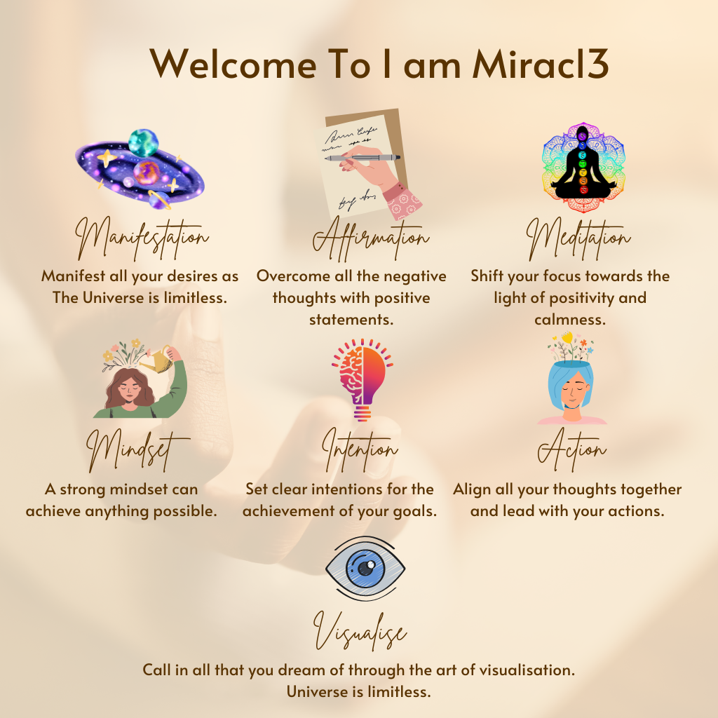 At "I am Miracle," we believe in the inherent power of manifestation to unlock the doors to abundance, joy, and fulfillment. Through the art of positive thinking, visualization, mindset, belief and surrender,, we offer a pathway to manifesting your dreams with intention and purpose.